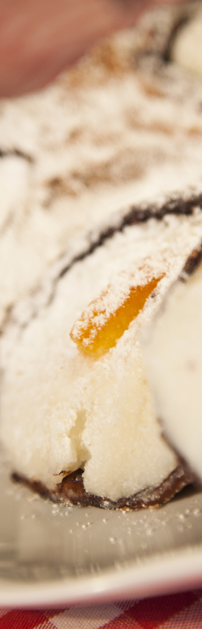 Massa enrotllada amb forma de tub a força de farina, cacau, ous, emplena de ricotta i sucre